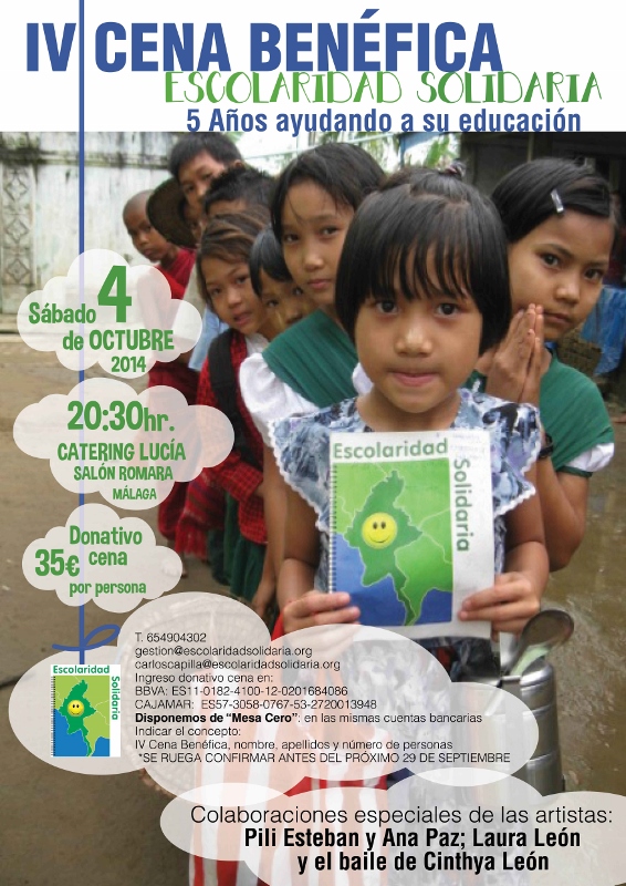 Quedan pocos días para la Cena Benéfica de Escolaridad Solidaria, el próximo 4 de Octubre. Nos gustaría contar con vosotros en la misma y pasar una gran noche llena de Solidaridad. Con vuestra asistencia contribuis a poder seguir ayudando en su educación a mas de 3.000 niños y niñas de Birmania y Nicaragua.
